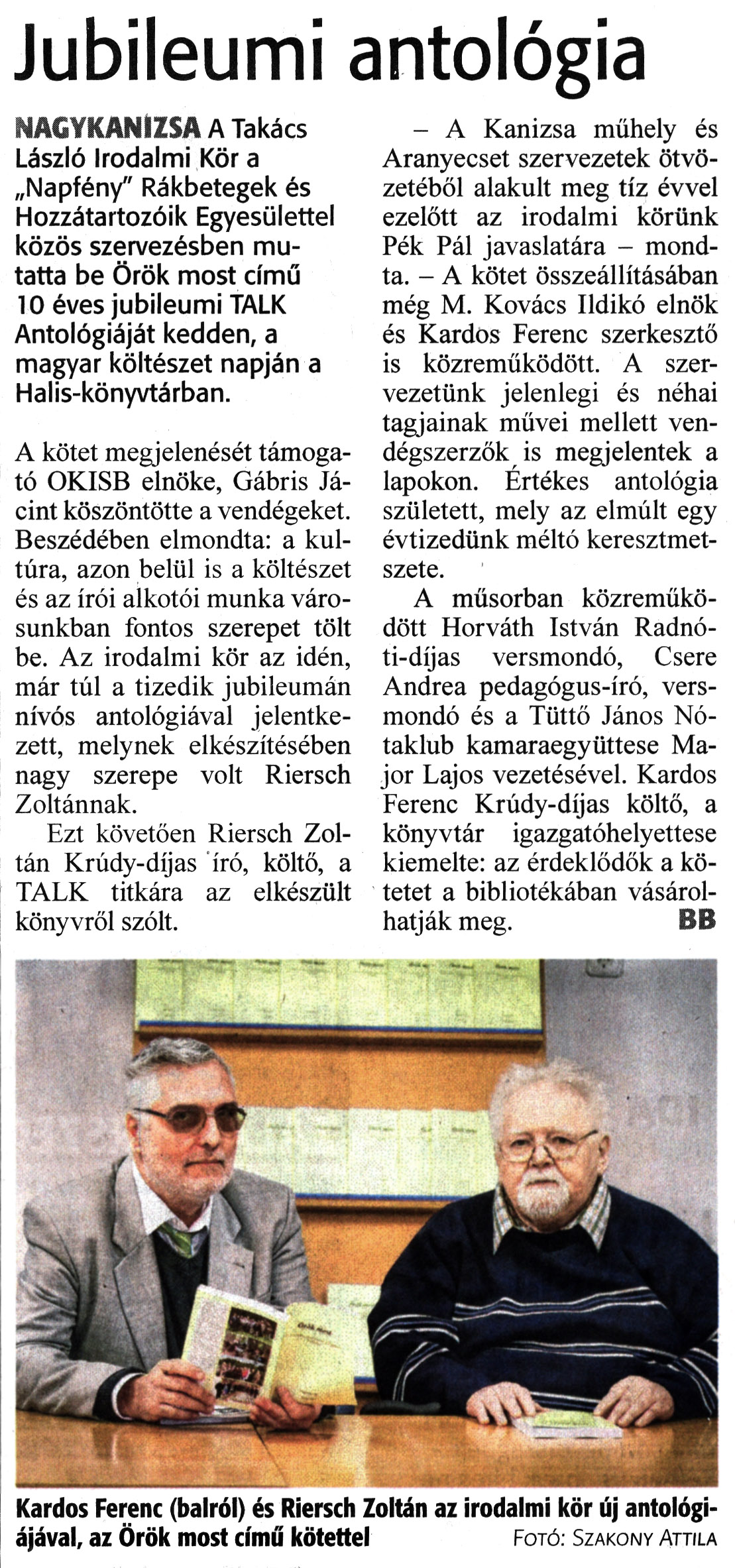 Nyilvános 1199 | 1444 | Zalai Hírlap 2023. április 13. 85. szám 2. oldal | Jubileumi antológia NAGYKANIZSA A Takács László Irodalmi Kör a „Napfény" Rákbetegek és Hozzátartozóik Egyesülettel közös szervezésben mutatta be Örök most című 10 éves jubileumi TALK Antológiáját kedden, a magyar költészet napján a Halis-könyvtárban. A kötet megjelenését támogató OKISB elnöke, Gábris Jácint köszöntötte a vendégeket. Beszédében elmondta: a kultúra, azon belül is a költészet és az írói alkotói munka városunkban fontos szerepet tölt be. Az irodalmi kör az idén, már túl a tizedik jubileumán nívós antológiával jelentkezett, melynek elkészítésében nagy szerepe volt Riersch Zoltánnak. Ezt követően Riersch Zoltán Krúdy-díjas író, költő, a TALK titkára az elkészült könyvről szólt. - A Kanizsa műhely és Aranyecset szervezetek ötvözetéből alakult meg tíz évvel ezelőtt az irodalmi körünk Pék Pál javaslatára - mondta. - A kötet összeállításában még M. Kovács Ildikó elnök és Kardos Ferenc szerkesztő is közreműködött. A szervezetünk jelenlegi és néhai tagjainak művei mellett vendégszerzők is megjelentek a lapokon. Értékes antológia született, mely az elmúlt egy évtizedünk méltó keresztmetszete. A műsorban közreműködött Horváth István Radnóti-díjas versmondó, Csere Andrea pedagógus-író, versmondó és a Tüttő János Nótaklub kamaraegyüttese Major Lajos vezetésével. Kardos Ferenc Krúdy-díjas költő, a könyvtár igazgatóhelyettese kiemelte: az érdeklődők a kötetet a bibliotékában vásárolhatják meg. BB Kardos Ferenc (balról) és Riersch Zoltán az irodalmi kör új antológiájával, az Örök most című kötettel Fotó. Szakony Attila |