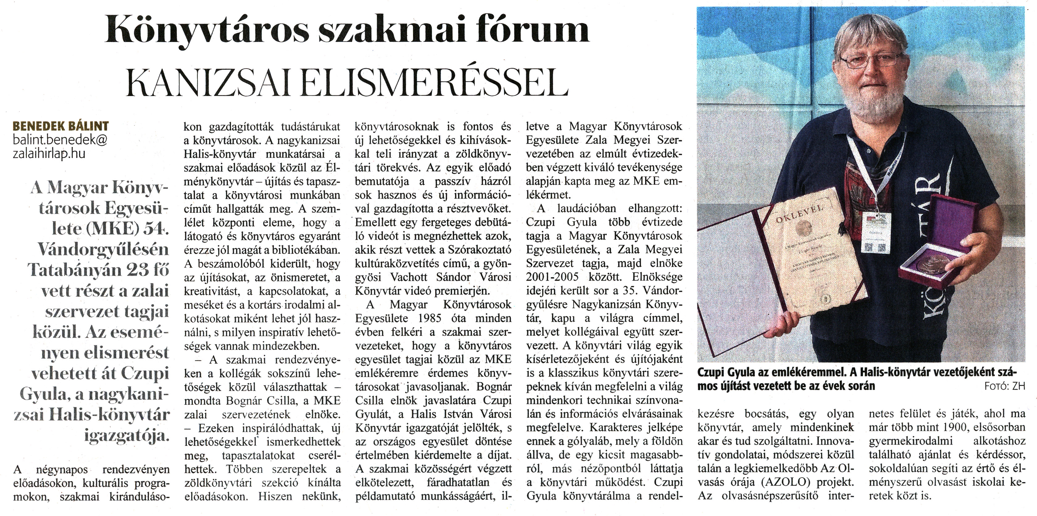 Nyilvános 1353 | 1953 | Zalai Hírlap 2023. augusztus 12. 87. szám 4. oldal | Könyvtáros szakmai fórum KANIZSAI ELISMERÉSSEL Czupi Gyula az emlékéremmel. A Halis-könyvtár vezetőjeként számos újítást vezetett be az évek során Fotó: ZM BENEDEK BÁLINT balint.benedek@ zalaihirlap.hu A Magyar Könyvtárosok Egyesülete (MKE) 54. Vándorgyűlésén Tatabányán 23 fő vett részt a zalai szervezet tagjai közül. Az eseményen elismerést vehetett át Czupi Gyula, a nagykanizsai Halis-könyvtár igazgatója. A négynapos rendezvényen előadásokon, kulturális programokon, szakmai kirándulásokon gazdagították tudástárukat a könyvtárosok. A nagykanizsai Halis-könyvtár munkatársai a szakmai előadások közül az Élménykönyvtár - újítás és tapasztalat a könyvtárosi munkában címűt hallgatták meg. A szemlélet központi eleme, hogy a látogató és könyvtáros egyaránt érezze jól magát a bibliotékában. A beszámolóból kiderült, hogy az újításokat, az önismeretet, a kreativitást, a kapcsolatokat, a meséket és a kortárs irodalmi alkotásokat miként lehet jól használni, s milyen inspiratív lehetőségek vannak mindezekben. - A szakmai rendezvényeken a kollégák sokszínű lehetőségek közül választhattak - mondta Bognár Csilla, a MKE zalai szervezetének elnöke. - Ezeken inspirálódhattak, új lehetőségekkel ismerkedhettek meg, tapasztalatokat cserélhettek. Többen szerepeltek a zöldkönyvtári szekció kínálta előadásokon. Hiszen nekünk, könyvtárosoknak is fontos és új lehetőségekkel és kihívásokkal teli irányzat a zöldkönyvtári törekvés. Az egyik előadó bemutatója a passzív házról sok hasznos és új információval gazdagította a résztvevőket. Emellett egy fergeteges debütáló videót is megnézhettek azok, akik részt vettek a Szórakoztató kultúraközvetítés című, a gyöngyösi Vachott Sándor Városi Könyvtár videó premierjén. A Magyar Könyvtárosok Egyesülete 1985 óta minden évben felkéri a szakmai szervezeteket, hogy a könyvtáros egyesület tagjai közül az MKE emlékéremre érdemes könyvtárosokat javasoljanak. Bognár Csilla elnök javaslatára Czupi Gyulát, a Halis István Városi Könyvtár igazgatóját jelölték, s az országos egyesület döntése értelmében kiérdemelte a díjat. A szakmai közösségért végzett elkötelezett, fáradhatatlan és példamutató munkásságáért, illetve a Magyar Könyvtárosok Egyesülete Zala Megyei Szervezetében az elmúlt évtizedekben végzett kiváló tevékenysége alapján kapta meg az MKE emlékérmet. A laudációban elhangzott: Czupi Gyula több évtizede tagja a Magyar Könyvtárosok Egyesületének, a Zala Megyei Szervezet tagja, majd elnöke 2001-2005 között. Elnöksége idején került sor a 35. Vándorgyűlésre Nagykanizsán Könyvtár, kapu a világra címmel, melyet kollégáival együtt szervezett. A könyvtári világ egyik kísérletezőjeként és újítójaként is a klasszikus könyvtári szerepeknek kíván megfelelni a világ mindenkori technikai színvonalán és információs elvárásainak megfelelve. Karakteres jelképe ennek a gólyaláb, mely a földön állva, de egy kicsit magasabbról, más nézőpontból láttatja a könyvtári működést. Czupi Gyula könyvtárálma a rendelkezésre bocsátás, egy olyan könyvtár, amely mindenkinek akar és tud szolgáltatni. Innovatív gondolatai, módszerei közül talán a legkiemelkedőbb Az Olvasás órája (AZOLO) projekt. Az olvasásnépszerűsítő internetes felület és játék, ahol ma már több mint 1900, elsősorban gyermekirodalmi alkotáshoz található ajánlat és kérdéssor, sokoldalúan segíti az értő és élményszerű olvasást iskolai keretek közt is. |