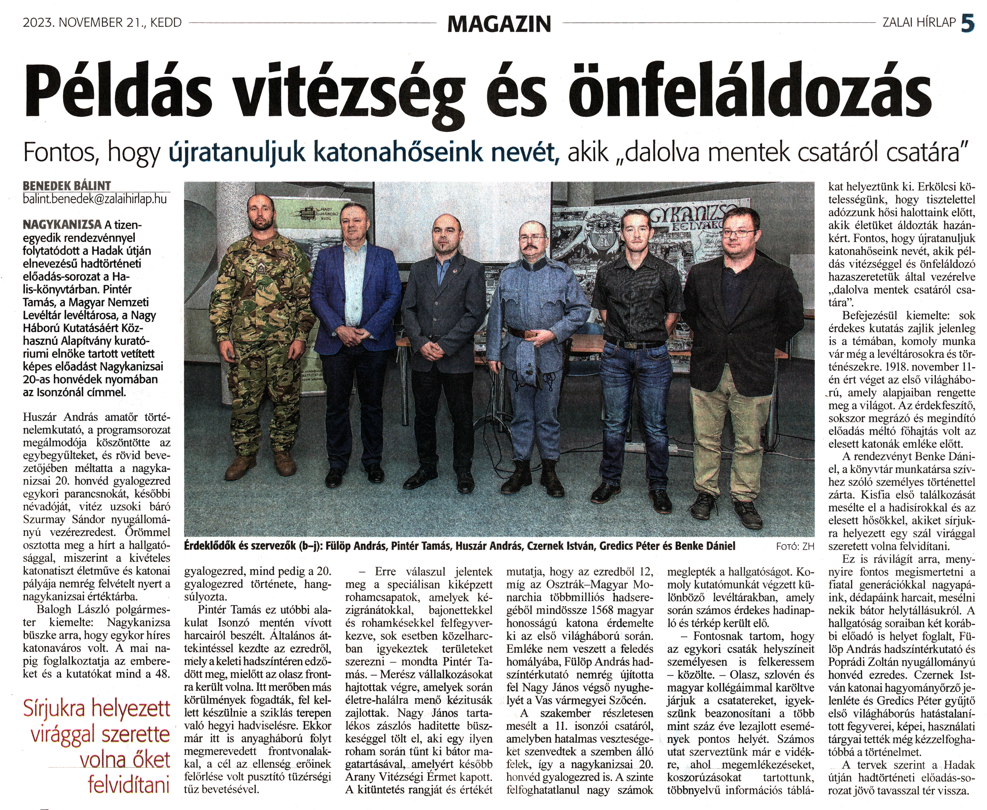 Nyilvános 1173 | 1472 | Zalai Hírlap 2023. november 21. 271. szám 5. oldal | Példás vitézség és önfeláldozás Fontos, hogy újratanuljuk katonahőseink nevét, akik „dalolva mentek csatáról csatára" Érdeklődők és szervezők (b-j): Fülöp András, Pintér Tamás, Huszár András, Czernek István, Gredics Péter és Benke Dániel Fotó: ZH BENEDEK BÁLINT balint.benedek@zalaihirlap.hu NAGYKANIZSA A tizenegyedik rendezvénnyel folytatódott a Hadak útján elnevezésű hadtörténeti előadás-sorozat a Halis-könyvtárban. Pintér Tamás, a Magyar Nemzeti Levéltár levéltárosa, a Nagy Háború Kutatásáért Közhasznú Alapítvány kuratóriumi elnöke tartott vetített képes előadást Nagykanizsai 20-as honvédek nyomában az Isonzónál címmel. Huszár András amatőr történelemkutató, a programsorozat megálmodója köszöntötte az egybegyűlteket, és rövid bevezetőjében méltatta a nagykanizsai 20. honvéd gyalogezred egykori parancsnokát, későbbi névadóját, vitéz uzsoki báró Szurmay Sándor nyugállományú vezérezredest. Örömmel osztotta meg a hírt a hallgatósággal, miszerint a kivételes katonatiszt életműve és katonai pályája nemrég felvételt nyert a nagykanizsai értéktárba. Balogh László polgármester kiemelte: Nagykanizsa büszke arra, hogy egykor híres katonaváros volt. A mai napig foglalkoztatja az embereket és a kutatókat mind a 48. gyalogezred, mind pedig a 20. gyalogezred története, hangsúlyozta. Pintér Tamás ez utóbbi alakulat Isonzó mentén vívott harcairól beszélt. Általános áttekintéssel kezdte az ezredről, mely a keleti hadszíntéren edződött meg, mielőtt az olasz frontra került volna. Itt merőben más körülmények fogadták, fel kellett készülnie a sziklás terepen való hegyi hadviselésre. Ekkor már itt is anyagháború folyt megmerevedett frontvonalakkal, a cél az ellenség erőinek felőrlése volt pusztító tüzérségi tűz bevetésével. - Erre válaszul jelentek meg a speciálisan kiképzett rohamcsapatok, amelyek kézigránátokkal, bajonettekkel és rohamkésekkel felfegyverkezve, sok esetben közelharcban igyekeztek területeket szerezni - mondta Pintér Tamás. - Merész vállalkozásokat hajtottak végre, amelyek során életre-halálra menő kézitusák zajlottak. Nagy János tartalékos zászlós haditette büszkeséggel tölt el, aki egy ilyen roham során tűnt ki bátor magatartásával, amelyért később Arany Vitézségi Érmet kapott. A kitüntetés rangját és értékét mutatja, hogy az ezredből 12, míg az Osztrák-Magyar Monarchia többmilliós hadseregéből mindössze 1568 magyar honosságú katona érdemelte ki az első világháború során. Emléke nem veszett a feledés homályába, Fülöp András hadszíntérkutató nemrég újította fel Nagy János végső nyughelyét a Vas vármegyei Szőcén. A szakember részletesen mesélt a 11. isonzói csatáról, amelyben hatalmas veszteségeket szenvedtek a szemben álló felek, így a nagykanizsai 20. honvéd gyalogezred is. A szinte felfoghatatlanul nagy számok meglepték a hallgatóságot. Komoly kutatómunkát végzett különböző levéltárakban, amely során számos érdekes hadinapló és térkép került elő. - Fontosnak tartom, hogy az egykori csaták helyszíneit személyesen is felkeressem - közölte. - Olasz, szlovén és magyar kollégáimmal karöltve járjuk a csatatereket, igyekszünk beazonosítani a több mint száz éve lezajlott események pontos helyét. Számos utat szerveztünk már e vidékre, ahol megemlékezéseket, koszorúzásokat tartottunk, többnyelvű információs táblákat helyeztünk ki. Erkölcsi kötelességünk, hogy tisztelettel adózzunk hősi halottaink előtt, akik életüket áldozták hazánkért. Fontos, hogy újratanuljuk katonahőseink nevét, akik példás vitézséggel és önfeláldozó hazaszeretetük által vezérelve „dalolva mentek csatáról csatára". Befejezésül kiemelte: sok érdekes kutatás zajlik jelenleg is a témában, komoly munka vár még a levéltárosokra és történészekre. 1918. november 11-én ért véget az első világháború, amely alapjaiban rengette meg a világot. Az érdekfeszítő, sokszor megrázó és megindító előadás méltó főhajtás volt az elesett katonák emléke előtt. A rendezvényt Benke Dániel, a könyvtár munkatársa szívhez szóló személyes történettel zárta. Kisfia első találkozását mesélte el a hadisírokkal és az elesett hősökkel, akiket sírjukra helyezett egy szál virággal szeretett volna felvidítani. Ez is rávilágít arra, menynyire fontos megismertetni a fiatal generációkkal nagyapáink, dédapáink harcait, mesélni nekik bátor helytállásukról. A hallgatóság soraiban két korábbi előadó is helyet foglalt, Fülöp András hadszíntérkutató és Poprádi Zoltán nyugállományú honvéd ezredes. Czernek István katonai hagyományőrző jelenléte és Gredics Péter gyűjtő első világháborús hatástalanított fegyverei, képei, használati tárgyai tették még kézzelfoghatóbbá a történelmet. A tervek szerint a Hadak útján hadtörténeti előadás-sorozatjövő tavasszal tér vissza. |