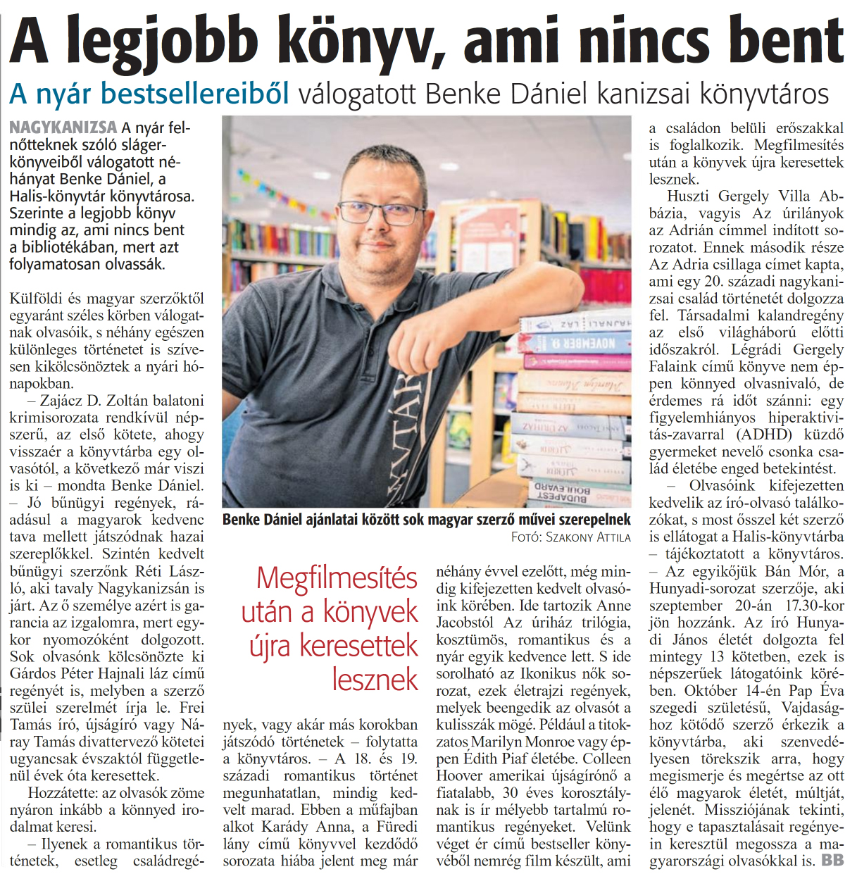 Nyilvános 1035 | 1380 | Zalai Hírlap 2024. szeptember 9. 210. szám 2. oldal | A legjobb könyv, ami nincs bent NAGYKANIZSA A nyár felnőtteknek szóló slágerkönyveiből válogatott néhányat Benke Dániel, a Halis-könyvtár könyvtárosa. Szerinte a legjobb könyv mindig az, ami nincs bent a bibliotékában, mert azt folyamatosan olvassák. Külföldi és magyar szerzőktől egyaránt széles körben válogatnak olvasóik, s néhány egészen különleges történetet is szívesen kikölcsönöztek a nyári hónapokban. - Zajácz D. Zoltán balatoni krimisorozata rendkívül népszerű, az első kötete, ahogy visszaér a könyvtárba egy olvasótól, a következő már viszi is ki - mondta Benke Dániel. - Jó bűnügyi regények, ráadásul a magyarok kedvenc tava mellett játszódnak hazai szereplőkkel. Szintén kedvelt bűnügyi szerzőnk Réti László, aki tavaly Nagykanizsán is járt. Az ő személye azért is garancia az izgalomra, mert egykor nyomozóként dolgozott. Sok olvasónk kölcsönözte ki Gárdos Péter Hajnali láz című regényét is, melyben a szerző szülei szerelmét írja le. Frei Tamás író, újságíró vagy Náray Tamás divattervező kötetei ugyancsak évszaktól függetlenül évek óta keresettek. Hozzátette: az olvasók zöme nyáron inkább a könnyed irodalmat keresi. - Ilyenek a romantikus történetek, esetleg családregények, vagy akár más korokban játszódó történetek - folytatta a könyvtáros. - A 18. és 19. századi romantikus történet megunhatatlan, mindig kedvelt marad. Ebben a műfajban alkot Karády Anna, a Füredi lány című könyvvel kezdődő sorozata hiába jelent meg már néhány évvel ezelőtt, még mindig kifejezetten kedvelt olvasóink körében. Ide tartozik Anne Jacobstól Az úriház trilógia, kosztümös, romantikus és a nyár egyik kedvence lett. S ide sorolható az Ikonikus nők sorozat, ezek életrajzi regények, melyek beengedik az olvasót a kulisszák mögé. Például a titokzatos Marilyn Monroe vagy éppen Edith Piaf életébe. Colleen Hoover amerikai újságírónő a fiatalabb, 30 éves korosztálynak is ír mélyebb tartalmú romantikus regényeket. Velünk véget ér című bestseller könyvéből nemrég film készült, ami a családon belüli erőszakkal is foglalkozik. Megfilmesítés után a könyvek újra keresettek lesznek. Huszti Gergely Villa Abbázia, vagyis Az úrilányok az Adrián címmel indított sorozatot. Ennek második része Az Adria csillaga címet kapta, ami egy 20. századi nagykanizsai család történetét dolgozza fel. Társadalmi kalandregény az első világháború előtti időszakról. Légrádi Gergely Falaink című könyve nem éppen könnyed olvasnivaló, de érdemes rá időt szánni: egy figyelemhiányos hiperaktivitás-zavarral (ADHD) küzdő gyermeket nevelő csonka család életébe enged betekintést. - Olvasóink kifejezetten kedvelik az író-olvasó találkozókat, s most ősszel két szerző is ellátogat a Halis-könyvtárba - tájékoztatott a könyvtáros. - Az egyikőjük Bán Mór, a Hunyadi-sorozat szerzője, aki szeptember 20-án 17.30-kor jön hozzánk. Az író Hunyadi János életét dolgozta fel mintegy 13 kötetben, ezek is népszerűek látogatóink körében. Október 14-én Pap Éva szegedi születésű, Vajdasághoz kötődő szerző érkezik a könyvtárba, aki szenvedélyesen törekszik arra, hogy megismerje és megértse az ott élő magyarok életét, múltját, jelenét. Missziójának tekinti, hogy e tapasztalásait regényein keresztül megossza a magyarországi olvasókkal is. BB A nyár bestsellereiből válogatott Benke Dániel kanizsai könyvtáros Benke Dániel ajánlatai között sok magyar szerző művei szerepelnek Fotó: Szakony Attila |