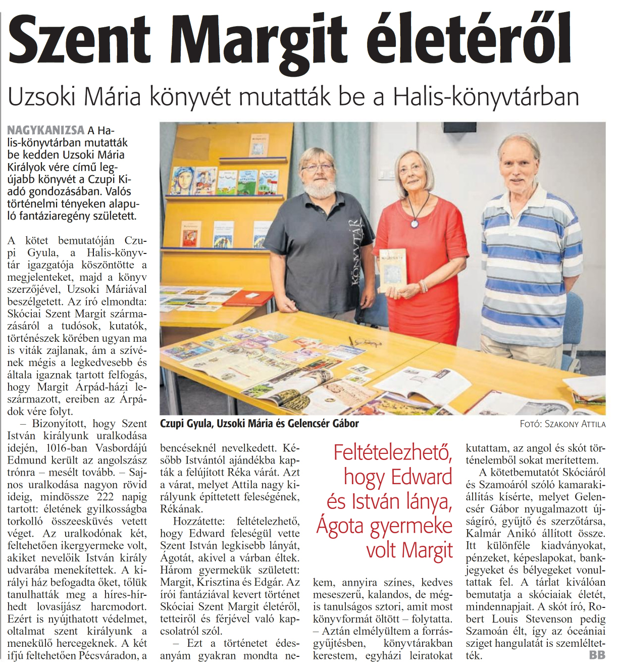 Nyilvános 1067 | 1389 | Zalai Hírlap 2024. szeptember 12. 213. szám 6. oldal | Szent Margit életéről Uzsoki Mária könyvét mutatták be a Halis-könyvtárban NAGYKANIZSA A Halis-könyvtárban mutatták be kedden Uzsoki Mária Királyok vére című legújabb könyvét a Czupi Kiadó gondozásában. Valós történelmi tényeken alapuló fantáziaregény született. A kötet bemutatóján Czupi Gyula, a Halis-könyvtár igazgatója köszöntötte a megjelenteket, majd a könyv szerzőjével, Uzsoki Máriával beszélgetett. Az író elmondta: Skóciai Szent Margit származásáról a tudósok, kutatók, történészek körében ugyan ma is viták zajlanak, ám a szívének mégis a legkedvesebb és általa igaznak tartott felfogás, hogy Margit Árpád-házi leszármazott, ereiben az Árpádok vére folyt. - Bizonyított, hogy Szent István királyunk uralkodása idején, 1016-ban Vasbordájú Edmund került az angolszász trónra - mesélt tovább. - Sajnos uralkodása nagyon rövid ideig, mindössze 222 napig tartott: életének gyilkosságba torkolló összeesküvés vetett véget. Az uralkodónak két, feltehetően ikergyermeke volt, akiket nevelőik István király udvarába menekítettek. A királyi ház befogadta őket, tőlük tanulhatták meg a híres-hírhedt lovasíjász harcmodort. Ezért is nyújthatott védelmet, oltalmat szent királyunk a menekülő hercegeknek. A két ifjú feltehetően Pécsváradon, a bencéseknél nevelkedett. Később Istvántól ajándékba kapták a felújított Réka várát. Azt a várat, melyet Attila nagy királyunk építtetett feleségének, Rékának. Hozzátette: feltételezhető, hogy Edvvard feleségül vette Szent István legkisebb lányát, Ágotát, akivel a várban éltek. Három gyermekük született: Margit, Krisztina és Edgár. Az írói fantáziával kevert történet Skóciai Szent Margit életéről, tetteiről és férjével való kapcsolatról szól. - Ezt a történetet édesanyám gyakran mondta nekem, annyira színes, kedves meseszerű, kalandos, de mégis tanulságos sztori, amit most könyvformát öltött - folytatta. - Aztán elmélyültem a forrásgyűjtésben, könyvtárakban kerestem, egyházi leiratokat kutattam, az angol és skót történelemből sokat merítettem. A kötetbemutatót Skóciáról és Szamoáról szóló kamarakiállítás kísérte, melyet Gelencsér Gábor nyugalmazott újságíró, gyűjtő és szerzőtársa, Kalmár Ánikó állított össze. Itt különféle kiadványokat, pénzeket, képeslapokat, bankjegyeket és bélyegeket vonultattak fel. A tárlat kiválóan bemutatja a skóciaiak életét, mindennapjait. A skót író, Róbert Louis Stevenson pedig Szamoán élt, így az óceániai sziget hangulatát is szemléltették. BB Czupi Gyula, Uzsoki Mária és Gelencsér Gábor Fotó: Szakony Attila |