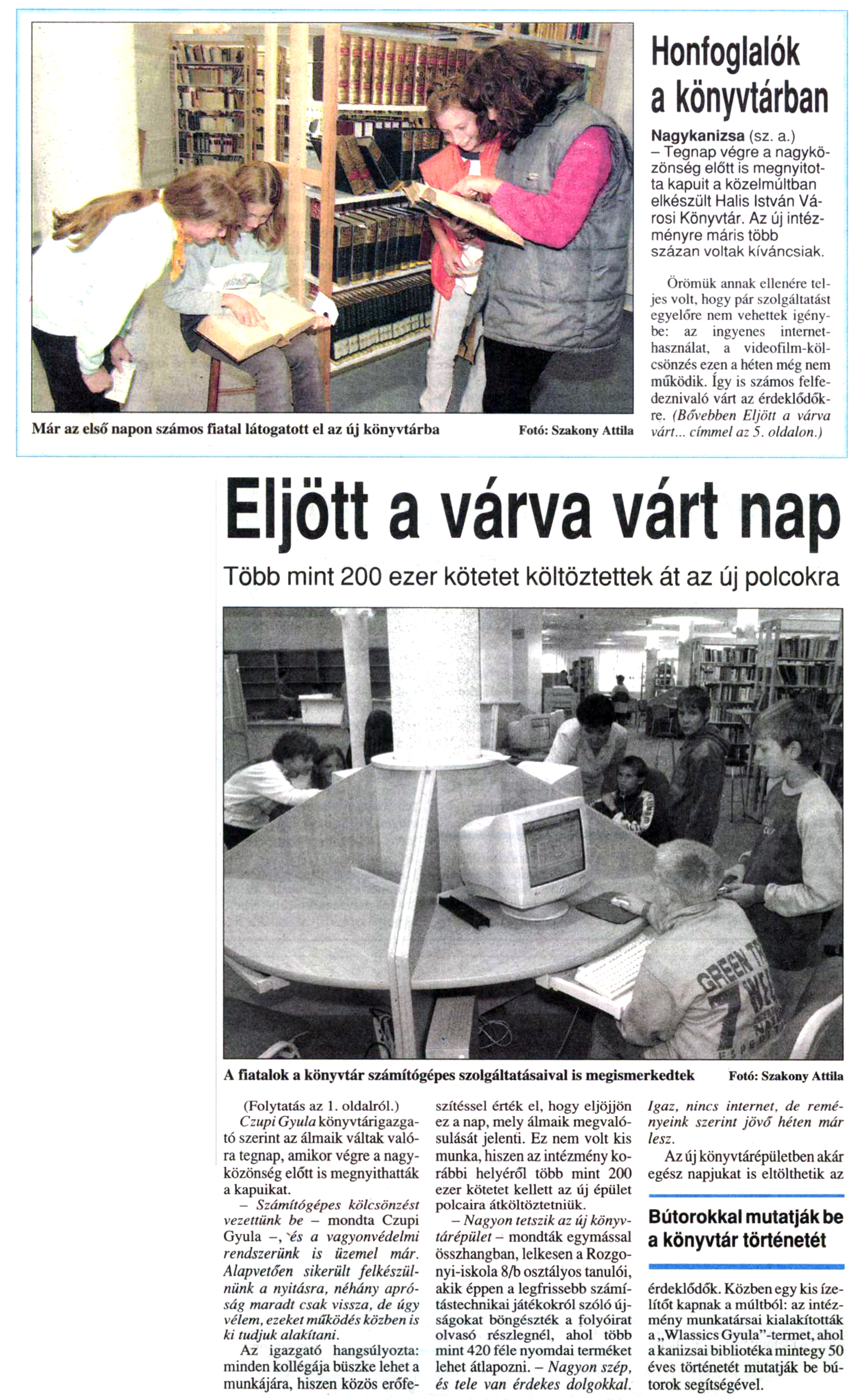 Nyilvános 1074 | 1211 | Zalai Hírlap 2001. október 2. 230. szám 1, 5. oldal | Már az első napon számos fiatal látogatott el az új könyvtárba Fotó: Szakony Attila Honfoglalók a könyvtárban Nagykanizsa (sz. a.) - Tegnap végre a nagyközönség előtt is megnyitotta kapuit a közelmúltban elkészült Halis István Városi Könyvtár. Az új intézményre máris több százan voltak kíváncsiak. Örömük annak ellenére teljes volt, hogy pár szolgáltatást egyelőre nem vehettek igénybe: az ingyenes internethasználat, a videofilm-kölcsönzés ezen a héten még nem működik. így is számos felfe-deznivaló várt az érdeklődőkre. (Bővebben Eljött a várva várt... címmel az 5. oldalon.) Eljött a várva várt nap Több mint 200 ezer kötetet költöztettek át az új polcokra A fiatalok a könyvtár számítógépes szolgáltatásaival is megismerkedtek Fotó: Szakony Attila (Folytatás az 1. oldalról.) Czupi Gyula könyvtárigazgató szerint az álmaik váltak valóra tegnap, amikor végre a nagyközönség előtt is megnyithatták a kapuikat. - Számítógépes kölcsönzést vezettünk be - mondta Czupi Gyula -, és a vagyonvédelmi rendszerünk is üzemel már. Alapvetően sikerült felkészülnünk a nyitásra, néhány apróság maradt csak vissza, de úgy vélem, ezeket működés közben is ki tudjuk alakítani. Az igazgató hangsúlyozta: minden kollégája büszke lehet a munkájára, hiszen közös erőfeszítéssel érték el, hogy eljöjjön ez a nap, mely álmaik megvalósulását jelenti. Ez nem volt kis munka, hiszen az intézmény korábbi helyéről több mint 200 ezer kötetet kellett az új épület polcaira átköltöztetniük. — Nagyon tetszik az új könyvtárépület - mondták egymással összhangban, lelkesen a Rozgonyi-iskola 8/b osztályos tanulói, akik éppen a legfrissebb számítástechnikai játékokról szóló újságokat böngészték a folyóirat olvasó részlegnél, ahol több mint 420 féle nyomdai terméket lehet átlapozni. - Nagyon szép, és tele van érdekes dolgokkal. Igaz, nincs internet, de reményeink szerint jövő héten már lesz. Az új könyvtárépületben akár egész napjukat is eltölthetik az érdeklődők. Közben egy kis ízelítőt kapnak a múltból: az intézmény munkatársai kialakították a „Wlassics Gyula"-termet, ahol a kanizsai bibliotéka mintegy 50 éves történetét mutatják be bútorok segítségével. |