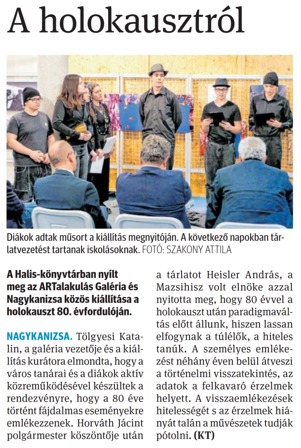 Nyilvános 776 | 1262 | Zalai Hírlap 2025. április 2. 77. szám 1. oldal | A holokausztról A Halis-könyvtárban nyílt meg az ARTalakulás Galéria és Nagykanizsa közös kiállítása a holokauszt 80. évfordulóján. NAGYKANIZSA. Tölgyesi Katalin, a galéria vezetője és a kiállítás kurátora elmondta, hogy a város tanárai és a diákok aktív közreműködésével készültek a rendezvényre, hogy a 80 éve történt fájdalmas eseményekre emlékezzenek. Horváth Jácint polgármester köszöntője után a tárlatot Heisler András, a Mazsihisz volt elnöke azzal nyitotta meg, hogy 80 évvel a holokauszt után paradigmaváltás előtt állunk, hiszen lassan elfogynak a túlélők, a hiteles tanúk. A személyes emlékezést néhány éven belül átveszi a történelmi visszatekintés, az adatok a felkavaró érzelmek helyett. A visszaemlékezések hitelességét s az érzelmek hiányát talán a művészetek tudják pótolni. (KT) Diákok adtak műsort a kiállítás megnyitóján. A következő napokban tárlatvezetést tartanak iskolásoknak. FOTÓ: SZAKONY ATTILA |