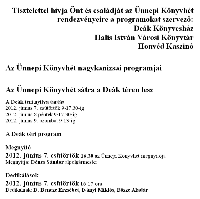 Nyilvános 1409 | 2749 | Tisztelettel hívja Önt és családját az Ünnepi Könyvhét rendezvényeire a programokat szervező: | Deák Könyvesház Halis István Városi Könyvtár Honvéd Kaszinó Az Ünnepi Könyvhét nagykanizsai programjai Az Ünnepi Könyvhét sátra a Deák téren lesz A Deák téri nyitva tartás 2012. június 7. csütörtök 9-17,30-ig 2012. június 8.péntek 9-17,30-ig 2012. június 9. szombat 9-13-ig A Deák téri program Megnyitó 2012. június 7. csütörtök 16,30 az Ünnepi Könyvhét megnyitója Megnyitja: Dénes Sándor alpolgármester Dedikálások 2012. június 7. csütörtök 16-17 óra Dedikálnak: D. Bencze Erzsébet, Iványi Miklós, Bősze Aladár |