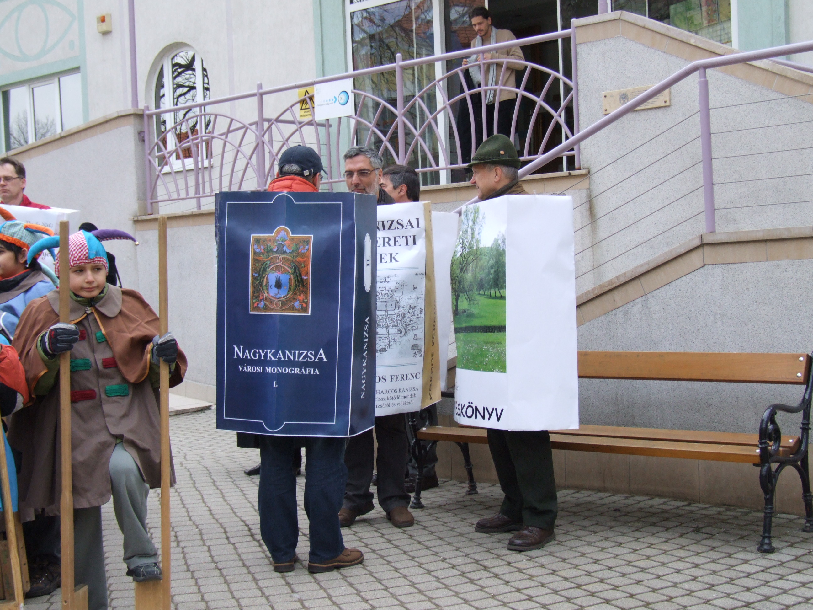 Nyilvános 1542 | 3079 | Rövid leírás | Teljes leírás (446 B) | 2013. február 9. A farsangi fánkfesztiválra készülve felhívásban kértük olvasóinkat, hogy öltsék magukra kedves könyvüket. Egy „könyvespolcnyi” jelentkező vette magára kedves olvasmányát, az ő vonulásukról készültek ezek a képek. A környezetükben néhol láthatók a Nagykanizsai Gólyalábasok, akik szintén a könyvtárhoz kötődnek. A „felvonuló kötetek” a könyvtár épületében még megtekinthetők. |