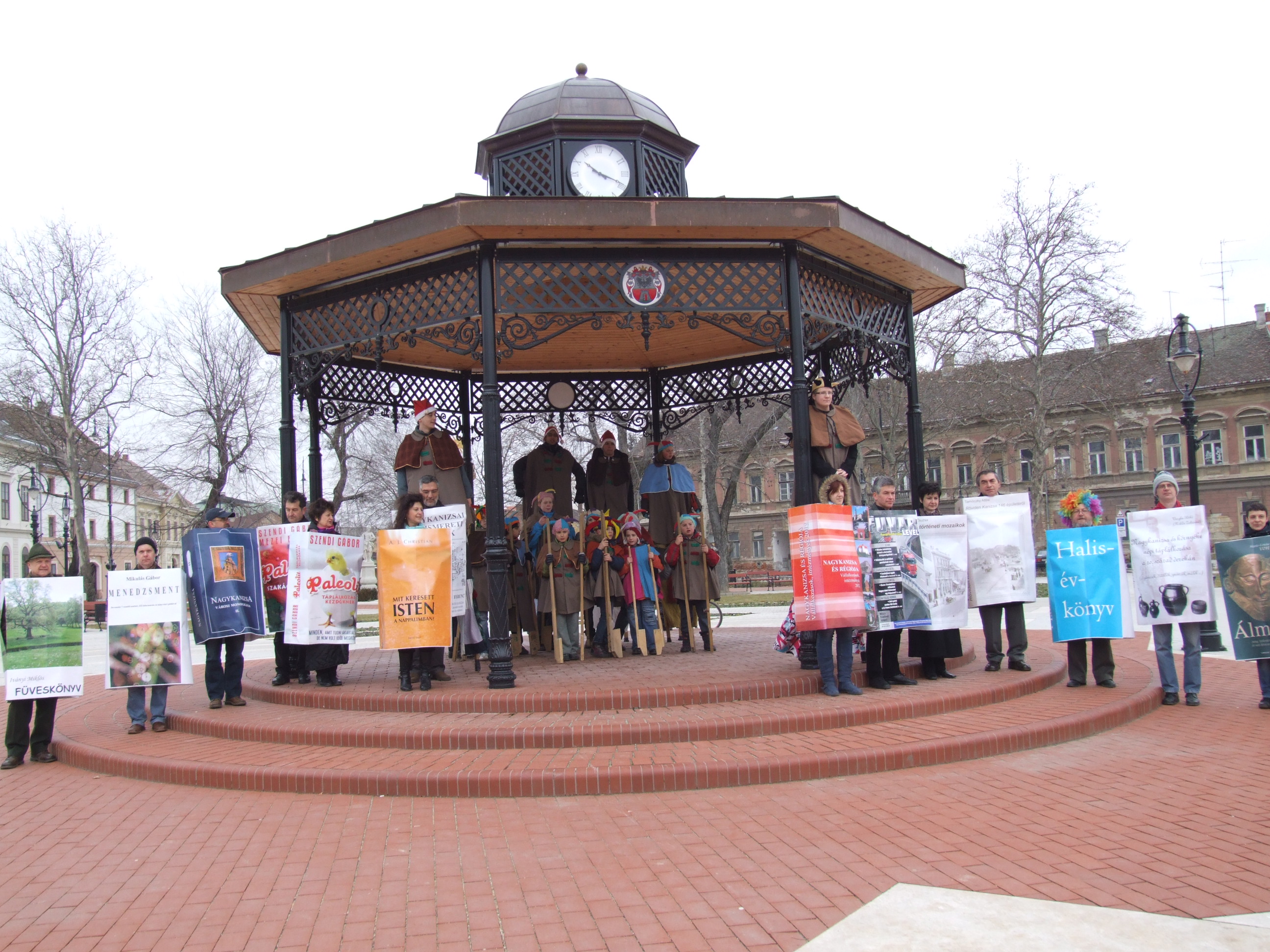 Nyilvános 1144 | 1480 | 2013. február 9. A farsangi fánkfesztiválra készülve felhívásban kértük olvasóinkat, hogy öltsék magukra kedves könyvüket. Egy „könyvespolcnyi” jelentkező vette magára kedves olvasmányát, az ő vonulásukról készültek ezek a képek. A környezetükben néhol láthatók a Nagykanizsai Gólyalábasok, akik szintén a könyvtárhoz kötődnek. A „felvonuló kötetek” a könyvtár épületében még megtekinthetők. | |