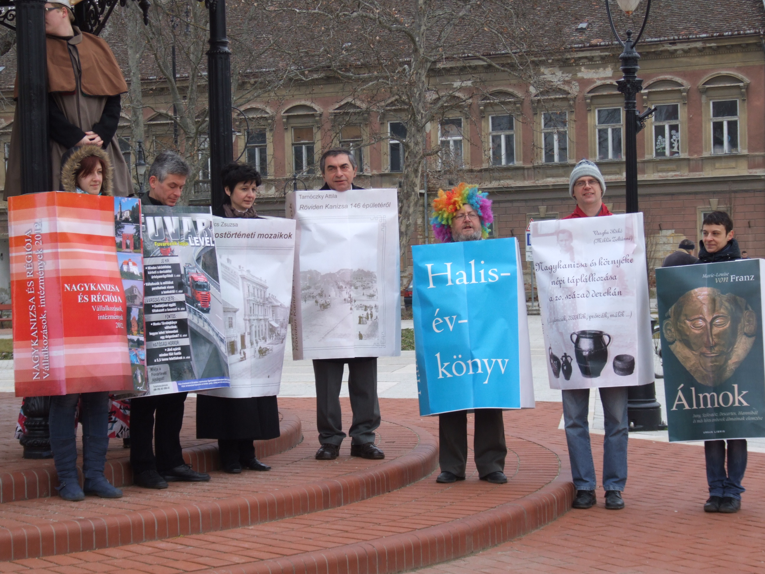 Nyilvános 1090 | 1442 | 2013. február 9. A farsangi fánkfesztiválra készülve felhívásban kértük olvasóinkat, hogy öltsék magukra kedves könyvüket. Egy „könyvespolcnyi” jelentkező vette magára kedves olvasmányát, az ő vonulásukról készültek ezek a képek. A környezetükben néhol láthatók a Nagykanizsai Gólyalábasok, akik szintén a könyvtárhoz kötődnek. A „felvonuló kötetek” a könyvtár épületében még megtekinthetők. | |