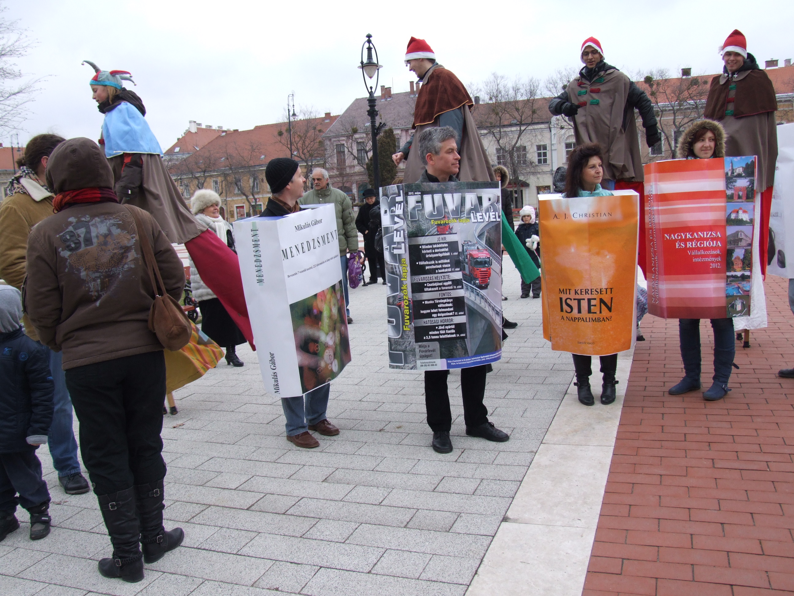 Nyilvános 1155 | 1481 | 2013. február 9. A farsangi fánkfesztiválra készülve felhívásban kértük olvasóinkat, hogy öltsék magukra kedves könyvüket. Egy „könyvespolcnyi” jelentkező vette magára kedves olvasmányát, az ő vonulásukról készültek ezek a képek. A környezetükben néhol láthatók a Nagykanizsai Gólyalábasok, akik szintén a könyvtárhoz kötődnek. A „felvonuló kötetek” a könyvtár épületében még megtekinthetők. | |