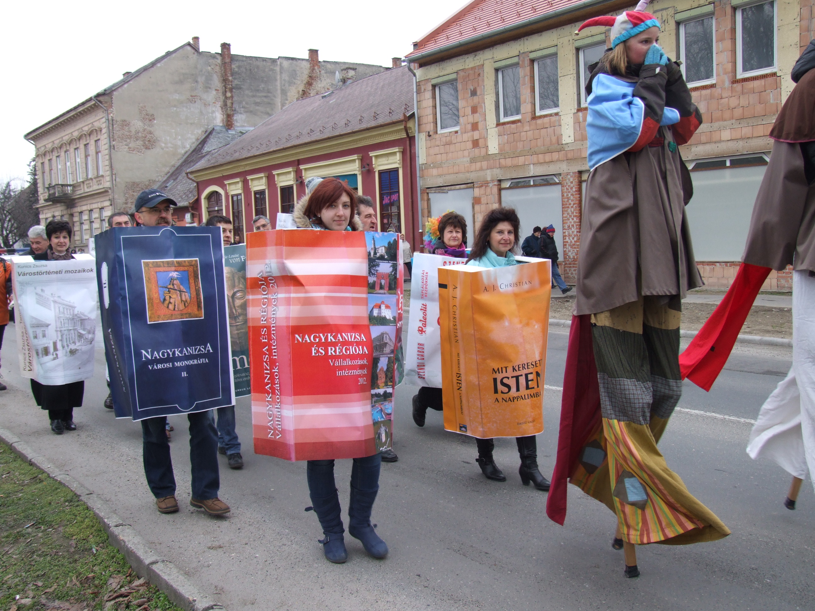 Nyilvános 1085 | 1441 | 2013. február 9. A farsangi fánkfesztiválra készülve felhívásban kértük olvasóinkat, hogy öltsék magukra kedves könyvüket. Egy „könyvespolcnyi” jelentkező vette magára kedves olvasmányát, az ő vonulásukról készültek ezek a képek. A környezetükben néhol láthatók a Nagykanizsai Gólyalábasok, akik szintén a könyvtárhoz kötődnek. A „felvonuló kötetek” a könyvtár épületében még megtekinthetők. | |