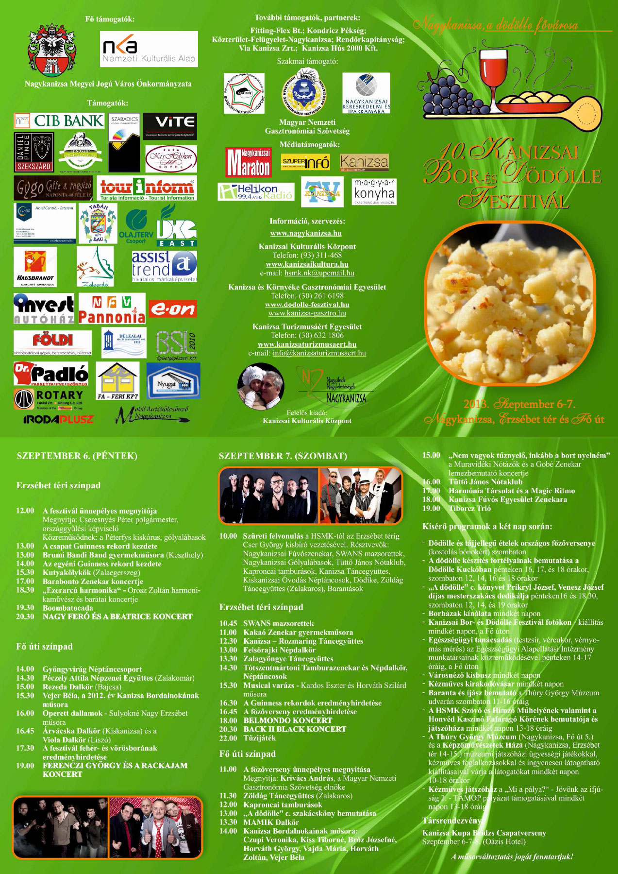 Nyilvános 1652 | 4397 | X. Kanizsai Bor- és Dödölle Fesztivál | 2013. szeptember 6. - 2013. szeptember 7. X. Kanizsai Bor- és Dödölle Fesztivál SZEPTEMBER 6. (PÉNTEK) Erzsébet téri színpad 12.00 A fesztivál ünnepélyes megnyitója Megnyitja: Cseresnyés Péter polgármester,országgyűlési képviselő Közreműködnek: a Péterfys kiskórus, gólyalábasok 13.00 A csapat Guinness rekord kezdete 13.00 Brumi Bandi Band gyermekműsora (Keszthely) 14.00 Az egyéni Guinness rekord kezdete 15.30 Kutyakölykök (Zalaegerszeg) 17.00 Barabonto Zenekar koncertje 18.30 „Ezerarcú harmonika“ - Orosz Zoltán harmonikaművész és barátai koncertje 19.30 Boombatocada 20.30 NAGY FERÓ ÉS A BEATRICE KONCERT Fő úti színpad 14.00 Gyöngyvirág Néptánccsoport 14.30 Péczely Attila Népzenei Együttes (Zalakomár) 15.00 Rezeda Dalkör (Bajcsa) 15.30 Vejer Béla, a 2012. év Kanizsa Bordalnokának műsora 16.00 Operett dallamok - Sulyokné Nagy Erzsébet műsora 16.45 Árvácska Dalkör (Kiskanizsa) és a Viola Dalkör (Liszó) 17.30 A fesztivál fehér- és vörösborának eredményhirdetése 19.00 FERENCZI GYÖRGY ÉS A RACKAJAM KONCERT SZEPTEMBER 7. (SZOMBAT) 10.00 Szüreti felvonulás a HSMK-tól az Erzsébet térig Cser György kisbíró vezetésével. Résztvevők: Nagykanizsai Fúvószenekar, SWANS mazsorettek, Nagykanizsai Gólyalábasok, Tüttő János Nótaklub, Kaproncai tamburások, Kanizsa Táncegyüttes, Kiskanizsai Óvodás Néptáncosok, Dödike, Zöldág Táncegyüttes (Zalakaros) Erzsébet téri színpad 10.45 SWANS mazsorettek 11.00 Kakaó Zenekar gyermekműsora 12.30 Kanizsa – Rozmaring Táncegyüttes 13.00 Felsőrajki Népdalkör 13.30 Zalagyöngye Táncegyüttes 14.30 Tótszentmártoni Tamburazenekar és Népdalkör, Néptáncosok 15.30 Musical varázs - Kardos Eszter és Horváth Szilárd műsora 16.30 A Guinness rekordok eredményhirdetése 16.45 A főzőverseny eredményhirdetése 18.00 BELMONDO KONCERT 20.30 BACK II BLACK KONCERT 22.00 Tűzijáték Fő úti színpad 11.00 A főzőverseny ünnepélyes megnyitása Megnyitja: Krivács András, a Magyar Nemzeti Gasztronómia Szövetség elnöke 11.30 Zöldág Táncegyüttes (Zalakaros) 12.00 Kaproncai tamburások 13.00 „A dödölle” c. szakácsköny bemutatása 13.30 MAMIK Dalkör 14.00 Kanizsa Bordalnokainak műsora: Czupi Veronika, Kiss Tiborné, Bróz Józsefné, Horváth György, Vajda Mária, Horváth Zoltán, Vejer Béla 15.00 „Nem vagyok tűznyelő, inkább a bort nyelném” a Muravidéki Nótázók és a Gobé Zenekar lemezbemutató koncertje 16.00 Tüttő János Nótaklub 17.00 Harmónia Társulat és a Magic Ritmo 18.00 Kanizsa Fúvós Egyesület Zenekara 19.00 Tiborcz Trió Kísérő programok a két nap során: · Dödölle és tájjellegű ételek országos főzőversenye (kóstolás bónokért) szombaton · A dödölle készítés fortélyainak bemutatása a Dödölle Kuckóban pénteken 16, 17, és 18 órakor, szombaton 12, 14, 16 és 18 órakor · „A dödölle” c. könyvet Prikryl József, Venesz József díjas mesterszakács dedikálja pénteken16 és 18,30, szombaton 12, 14, és 19 órakor · Borházak kínálata mindkét napon · Kanizsai Bor- és Dödölle Fesztivál fotókon – kiállítás mindkét napon, a Fő úton · Egészségügyi tanácsadás (testzsír, vércukor, vérnyomás mérés) az Egészségügyi Alapellátási Intézmény munkatársainak közreműködésével pénteken 14-17 óráig, a Fő úton · Városnéző kisbusz mindkét napon · Kézműves kirakodóvásár mindkét napon · A HSMK Szövő és Hímző Műhelyének valamint a Honvéd Kaszinó Fafaragó Körének bemutatója és játszóháza mindkét napon 13-18 óráig · A Thúry György Múzeum (Nagykanizsa, Fő út 5.) és a Képzőművészetek Háza (Nagykanizsa, Erzsébet tér 14-15.) múzeumi játszóházi ügyességi játékokkal, kézműves foglalkozásokkal és ingyenesen látogatható kiállításaival várja a látogatókat mindkét napon 10-18 órakor · Kézműves játszóház a „Mi a pálya?“ - Jövőnk az ifjúság 2. - TÁMOP pályázat támogatásával mindkét napon 13-18 óráig Társrendezvény: Kanizsa Kupa Bridzs Csapatverseny Szeptember 6-7-8. (Oázis Hotel) A szervezők a műsorváltoztatás jogát fenntartják! (Forrás: http://www.nagykanizsa.hu/index.php?m=2&year=2013&month=8&day=6) |