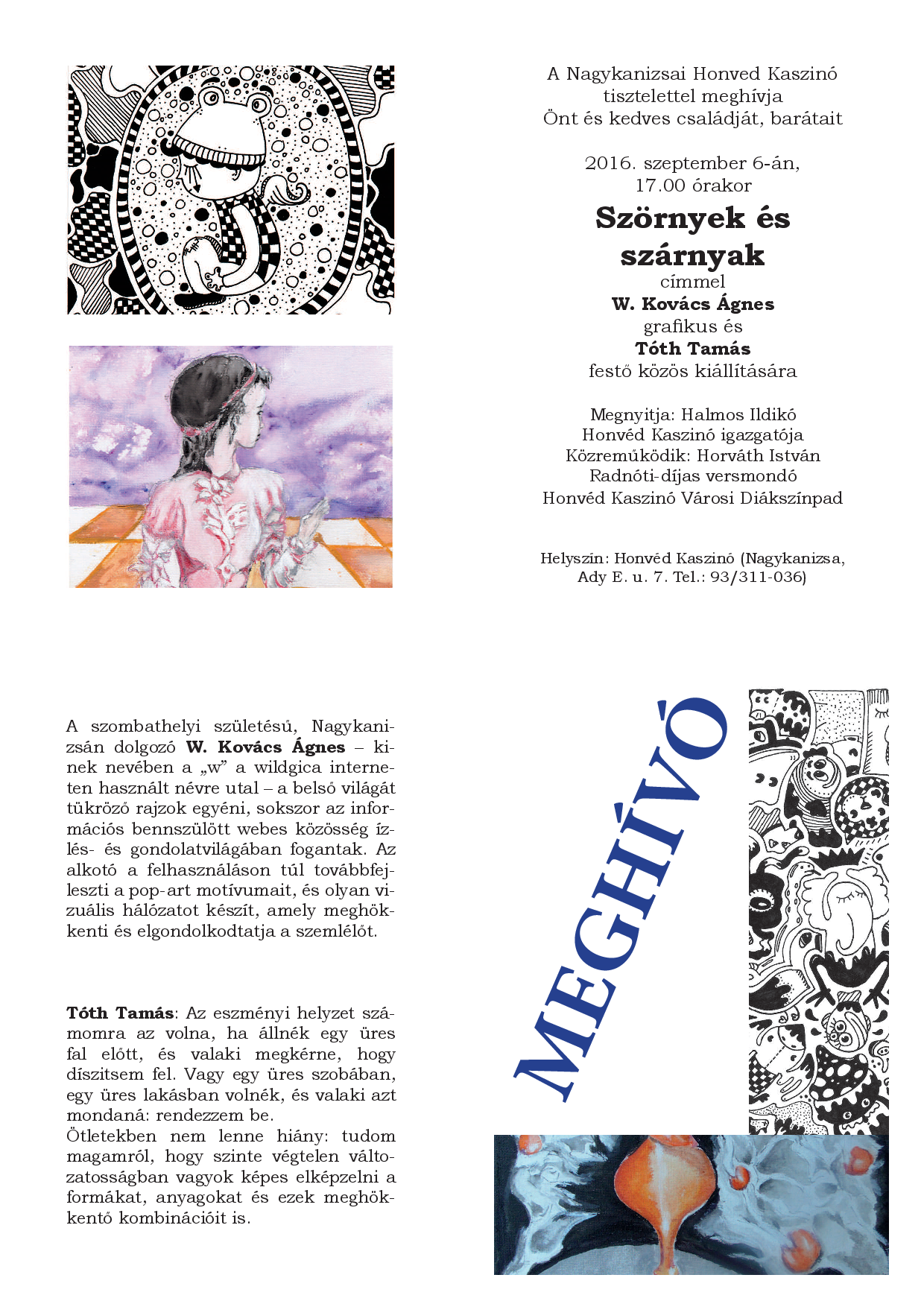 Nyilvános 1247 | 2157 | MEGHÍVÓ | A szombathelyi születésű, Nagykanizsán dolgozó W. Kovács Ágnes – kinek nevében a „w” a wildgica interneten használt névre utal – a belső világát tükröző rajzok egyéni, sokszor az információs bennszülött webes közösség ízlés- és gondolatvilágában fogantak. Az alkotó a felhasználáson túl továbbfejleszti a pop-art motívumait, és olyan vizuális hálózatot készít, amely meghökkenti és elgondolkodtatja a szemlélőt. Tóth Tamás: Az eszményi helyzet számomra az volna, ha állnék egy üres fal előtt, és valaki megkérne, hogy díszitsem fel. Vagy egy üres szobában, egy üres lakásban volnék, és valaki azt mondaná: rendezzem be. Ötletekben nem lenne hiány: tudom magamról, hogy szinte végtelen változatosságban vagyok képes elképzelni a formákat, anyagokat és ezek meghökkentő kombinációit is. A Nagykanizsai Honved Kaszinó tisztelettel meghívja Önt és kedves családját, barátait 2016. szeptember 6-án, 17.00 órakor Szörnyek és szárnyak címmel W. Kovács Ágnes grafikus és Tóth Tamás festő közös kiállítására Megnyitja: Halmos Ildikó Honvéd Kaszinó igazgatója Közreműködik: Horváth István Radnóti-díjas versmondó Honvéd Kaszinó Városi Diákszínpad Helyszín: Honvéd Kaszinó (Nagykanizsa, Ady E. u. 7. Tel.: 93/311-036) |