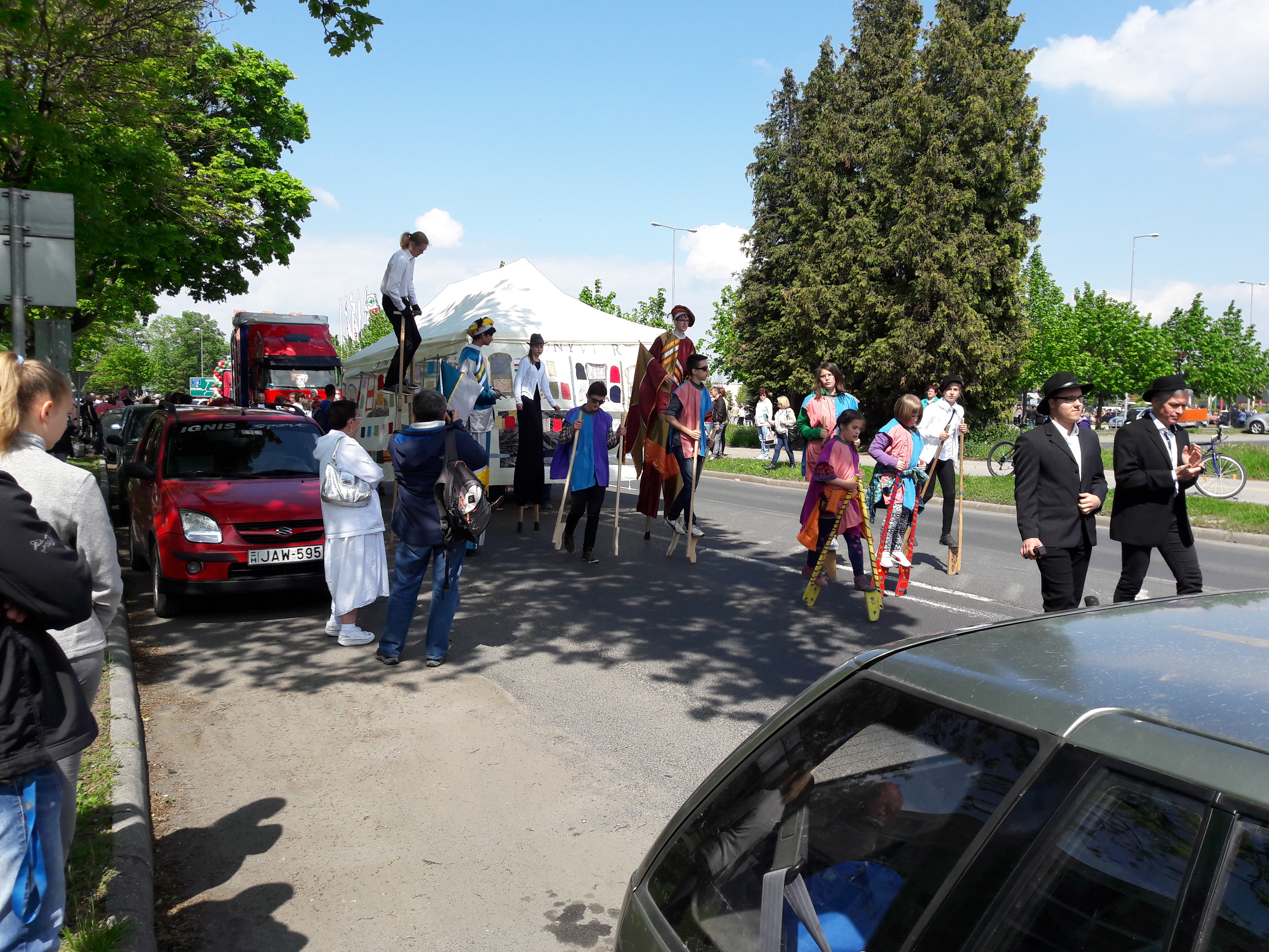 2017.04.30. Utca Tánc Fesztivál - Vonulás - Gólyalábasok, fekete kalapos táncosok, meridián tornások