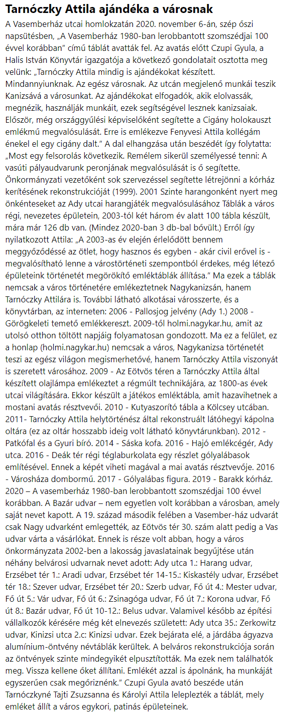 Nyilvános 1381 | 2118 | Tarnóczky Attila ajándéka a városnak | A Vasemberház utcai homlokzatán 2020. november 6-án, szép őszi napsütésben, „A Vasemberház 1980-ban lerobbantott szomszédjai 100 évvel korábban” című táblát avatták fel. Az avatás előtt Czupi Gyula, a Halis István Könyvtár igazgatója a következő gondolatait osztotta meg velünk: „Tarnóczky Attila mindig is ajándékokat készített. Mindannyiunknak. Az egész városnak. Az utcán megjelenő munkái teszik Kanizsává a városunkat. Az ajándékokat elfogadók, akik elolvassák, megnézik, használják munkáit, ezek segítségével lesznek kanizsaiak. Először, még országgyűlési képviselőként segítette a Cigány holokauszt emlékmű megvalósulását. Erre is emlékezve Fenyvesi Attila kollégám énekel el egy cigány dalt.” A dal elhangzása után beszédét így folytatta: „Most egy felsorolás következik. Remélem sikerül személyessé tenni: A vasúti pályaudvarunk peronjának megvalósulását is ő segítette. Önkormányzati vezetőként sok szervezéssel segítette létrejönni a kórház kerítésének rekonstrukcióját (1999). 2001 Szinte harangonként nyert meg önkénteseket az Ady utcai harangjáték megvalósulásához Táblák a város régi, nevezetes épületein, 2003-tól két három év alatt 100 tábla készült, mára már 126 db van. (Mindez 2020-ban 3 db-bal bővült.) Erről így nyilatkozott Attila: „A 2003-as év elején érlelődött bennem meggyőződéssé az ötlet, hogy hasznos és egyben - akár civil erővel is - megvalósítható lenne a várostörténeti szempontból érdekes, még létező épületeink történetét megörökítő emléktáblák állítása.” Ma ezek a táblák nemcsak a város történetére emlékeztetnek Nagykanizsán, hanem Tarnóczky Attilára is. További látható alkotásai városszerte, és a könyvtárban, az interneten: 2006 - Pallosjog jelvény (Ady 1.) 2008 - Görögkeleti temető emlékkereszt. 2009-től holmi.nagykar.hu, amit az utolsó otthon töltött napjáig folyamatosan gondozott. Ma ez a felület, ez a honlap (holmi.nagykar.hu) nemcsak a város, Nagykanizsa történetét teszi az egész világon megismerhetővé, hanem Tarnóczky Attila viszonyát is szeretett városához. 2009 - Az Eötvös téren a Tarnóczky Attila által készített olajlámpa emlékeztet a régmúlt technikájára, az 1800-as évek utcai világítására. Ekkor készült a játékos emléktábla, amit hazavihetnek a mostani avatás résztvevői. 2010 - Kutyaszorító tábla a Kölcsey utcában. 2011- Tarnóczky Attila helytörténész által rekonstruált látóhegyi kápolna oltára (ez az oltár hosszabb ideig volt látható könyvtárunkban). 2012 - Patkófal és a Gyuri bíró. 2014 - Sáska kofa. 2016 - Hajó emlékcégér, Ady utca. 2016 - Deák tér régi téglaburkolata egy részlet gólyalábasok említésével. Ennek a képét viheti magával a mai avatás résztvevője. 2016 - Városháza dombormű. 2017 - Gólyalábas figura. 2019 - Barakk kórház. 2020 – A vasemberház 1980-ban lerobbantott szomszédjai 100 évvel korábban. A Bazár udvar – nem egyetlen volt korábban a városban, amely saját nevet kapott. A 19. század második felében a Vasember-ház udvarát csak Nagy udvarként emlegették, az Eötvös tér 30. szám alatt pedig a Vas udvar várta a vásárlókat. Ennek is része volt abban, hogy a város önkormányzata 2002-ben a lakosság javaslatainak begyűjtése után néhány belvárosi udvarnak nevet adott: Ady utca 1.: Harang udvar, Erzsébet tér 1.: Aradi udvar, Erzsébet tér 14-15.: Kiskastély udvar, Erzsébet tér 18.: Szever udvar, Erzsébet tér 20.: Szerb udvar, Fő út 4.: Mester udvar, Fő út 5.: Vár udvar, Fő út 6.: Zsinagóga udvar, Fő út 7.: Korona udvar, Fő út 8.: Bazár udvar, Fő út 10-12.: Belus udvar. Valamivel később az építési vállalkozók kérésére még két elnevezés született: Ady utca 35.: Zerkowitz udvar, Kinizsi utca 2.c: Kinizsi udvar. Ezek bejárata elé, a járdába ágyazva alumínium-öntvény névtáblák kerültek. A belváros rekonstrukciója során az öntvények szinte mindegyikét elpusztították. Ma ezek nem találhatók meg. Vissza kellene őket állítani. Emlékét azzal is ápolnánk, ha munkáját egyszerűen csak megőriznénk.” Czupi Gyula avató beszéde után Tarnóczkyné Tajti Zsuzsanna és Károlyi Attila leleplezték a táblát, mely emléket állít a város egykori, patinás épületeinek. |
