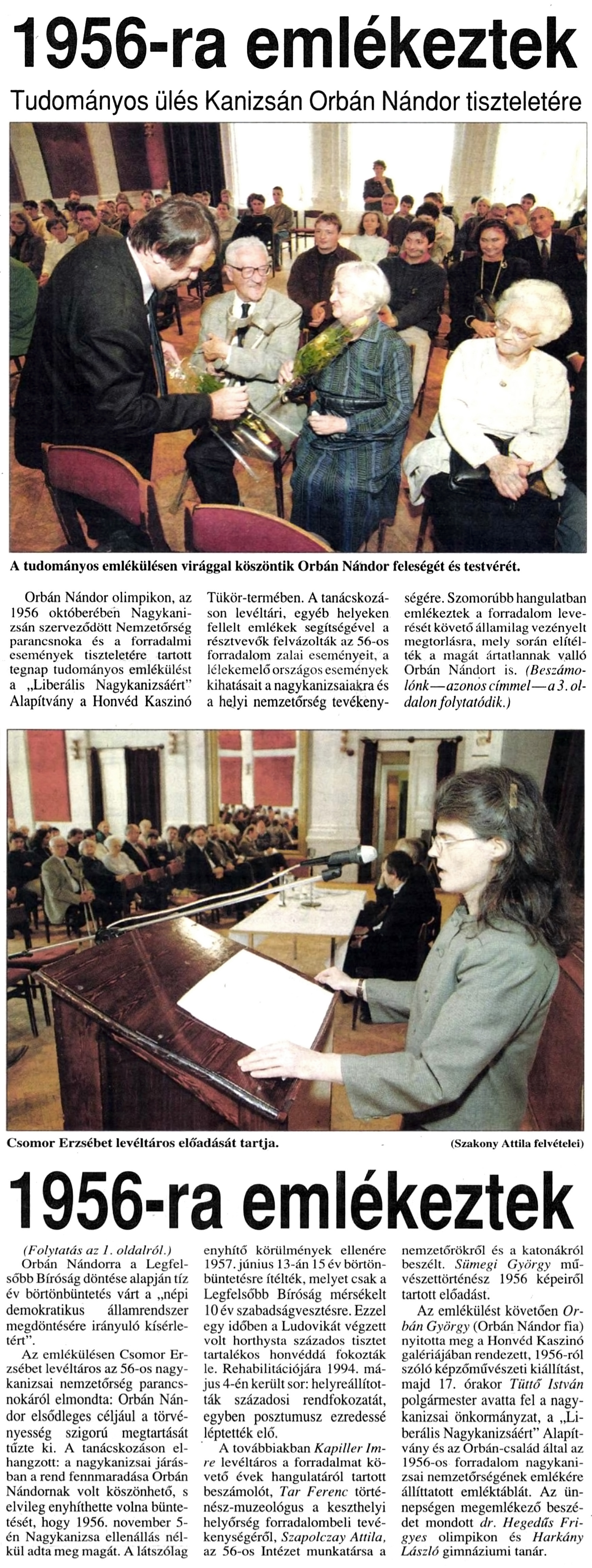 Nyilvános 1409 | 2237 | Zalai Hírlap 1998. október 16. 243. szám 1, 3. oldal | 1956-ra emlékeztek Tudományos ülés Kanizsán Orbán Nándor tiszteletére A tudományos emlékülésen virággal köszöntik Orbán Nándor feleségét és testvérét. Orbán Nándor olimpikon, az 1956 októberében Nagykanizsán szerveződött Nemzetőrség parancsnoka és a forradalmi események tiszteletére tartott tegnap tudományos emlékülést a „Liberális Nagykanizsáért” Alapítvány a Honvéd Kaszinó Tükör-termében. A tanácskozáson levéltári, egyéb helyeken fellelt emlékek segítségével a résztvevők felvázolták az 56-os forradalom zalai eseményeit, a lélekemelő országos események kihatásait a nagykanizsaiakra és a helyi nemzetőrség tevékenységére. Szomorúbb hangulatban emlékeztek a forradalom leverését követő államilag vezényelt megtorlásra, mely során elítélték a magát ártatlannak valló Orbán Nándort is. (Beszámolónk—azonos címmel—a 3. oldalon folytatódik.) Csömör Erzsébet levéltáros előadását tartja. (Szakony Attila felvételei) 1956-ra emlékeztek (Folytatás az 1. oldalról.) Orbán Nándorra a Legfelsőbb Bíróság döntése alapján tíz év börtönbüntetés várt a „népi demokratikus államrendszer megdöntésére irányuló kísérletért”. Az emlékülésen Csömör Erzsébet levéltáros az 56-os nagy- kanizsai nemzetőrség parancsnokáról elmondta: Orbán Nándor elsődleges céljául a törvényesség szigorú megtartását tűzte ki. A tanácskozáson elhangzott: a nagykanizsai járásban a rend fennmaradása Orbán Nándornak volt köszönhető, s elvileg enyhíthette volna büntetését, hogy 1956. november 5-én Nagykanizsa ellenállás nélkül adta meg magát. A látszólag enyhítő körülmények ellenére 1957. június 13-án 15 év börtönbüntetésre ítélték, melyet csak a Legfelsőbb Bíróság mérsékelt 10 év szabadságvesztésre. Ezzel egy időben a Ludovikát végzett volt horthysta százados tisztet tartalékos honvéddé fokozták le. Rehabilitációjára 1994. május 4-én került sor: helyreállították századosi rendfokozatát, egyben posztumusz ezredessé léptették elő. A továbbiakban Kapiller Imre levéltáros a forradalmat követő évek hangulatáról tartott beszámolót, Tar Ferenc történész-muzeológus a keszthelyi helyőrség forradalombeli tevékenységéről, Szapolczay Attila, az 56-os Intézet munkatársa a nemzetőrökről és a katonákról beszélt. Sümegi György művészettörténész 1956 képeiről tartott előadást. Az emlékülést követően Orbán György (Orbán Nándor fia) nyitotta meg a Honvéd Kaszinó galériájában rendezett, 1956-ról szóló képzőművészeti kiállítást, majd 17. órakor Tüttő István polgármester avatta fel a nagykanizsai önkormányzat, a „Liberális Nagykanizsáért” Alapítvány és az Orbán-család által az 1956-os forradalom nagykanizsai nemzetőrségének emlékére állíttatott emléktáblát. Az ünnepségen megemlékező beszédet mondott dr. Hegedűs Frigyes olimpikon és Harkány László gimnáziumi tanár. |
