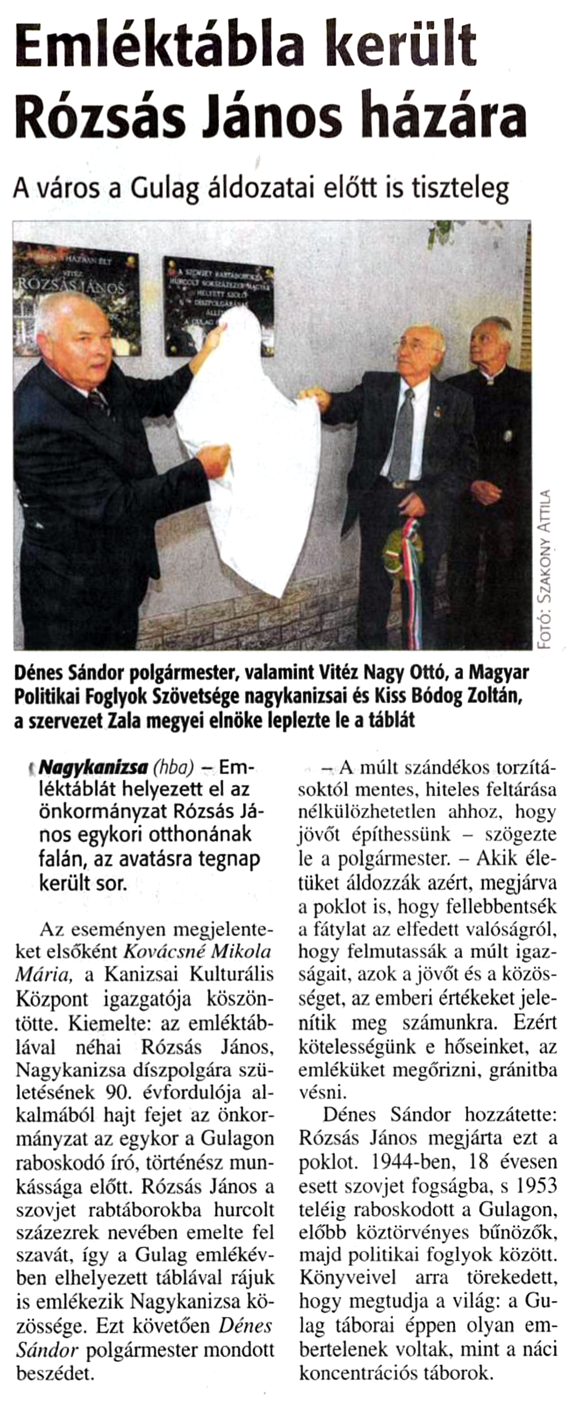 Nyilvános 917 | 1234 | Zalai Hírlap 2016. augusztus 17. 3. oldal | Emléktábla került Rózsás János házára A város a Gulag áldozatai előtt is tiszteleg Nagykanizsa (hba) - Emléktáblát helyezett el az önkormányzat Rózsás János egykori otthonának falán, az avatásra tegnap került sor. Az eseményen megjelenteket elsőként Kovácsné Mikola Mária, a Kanizsai Kulturális Központ igazgatója köszöntötte. Kiemelte: az emléktáblával néhai Rózsás János, Nagykanizsa díszpolgára születésének 90. évfordulója alkalmából hajt fejet az önkormányzat az egykor a Gulagon raboskodó író, történész munkássága előtt. Rózsás János a szovjet rabtáborokba hurcolt százezrek nevében emelte fel szavát, így a Gulag emlékévben elhelyezett táblával rájuk is emlékezik Nagykanizsa közössége. Ezt követően Dénes Sándor polgármester mondott beszédet. - A múlt szándékos torzításoktól mentes, hiteles feltárása nélkülözhetetlen ahhoz, hogy jövőt építhessünk - szögezte le a polgármester. - Akik életüket áldozzák azért, megjárva a poklot is, hogy fellebbentsék a fátylat az elfedett valóságról, hogy felmutassák a múlt igazságait, azok a jövőt és a közösséget, az emberi értékeket jelenítik meg számunkra. Ezért kötelességünk e hőseinket, az emléküket megőrizni, gránitba vésni. Dénes Sándor hozzátette: Rózsás János megjárta ezt a poklot. 1944-ben, 18 évesen esett szovjet fogságba, s 1953 teléig raboskodott a Gulagon, előbb köztörvényes bűnözők, majd politikai foglyok között. Könyveivel arra törekedett, hogy megtudja a világ: a Gulag táborai éppen olyan embertelenek voltak, mint a náci koncentrációs táborok. Dénes Sándor polgármester, valamint Vitéz Nagy Ottó, a Magyar Politikai Foglyok Szövetsége nagykanizsai és Kiss Bódog Zoltán, a szervezet Zala megyei elnöke leplezte le a táblát |