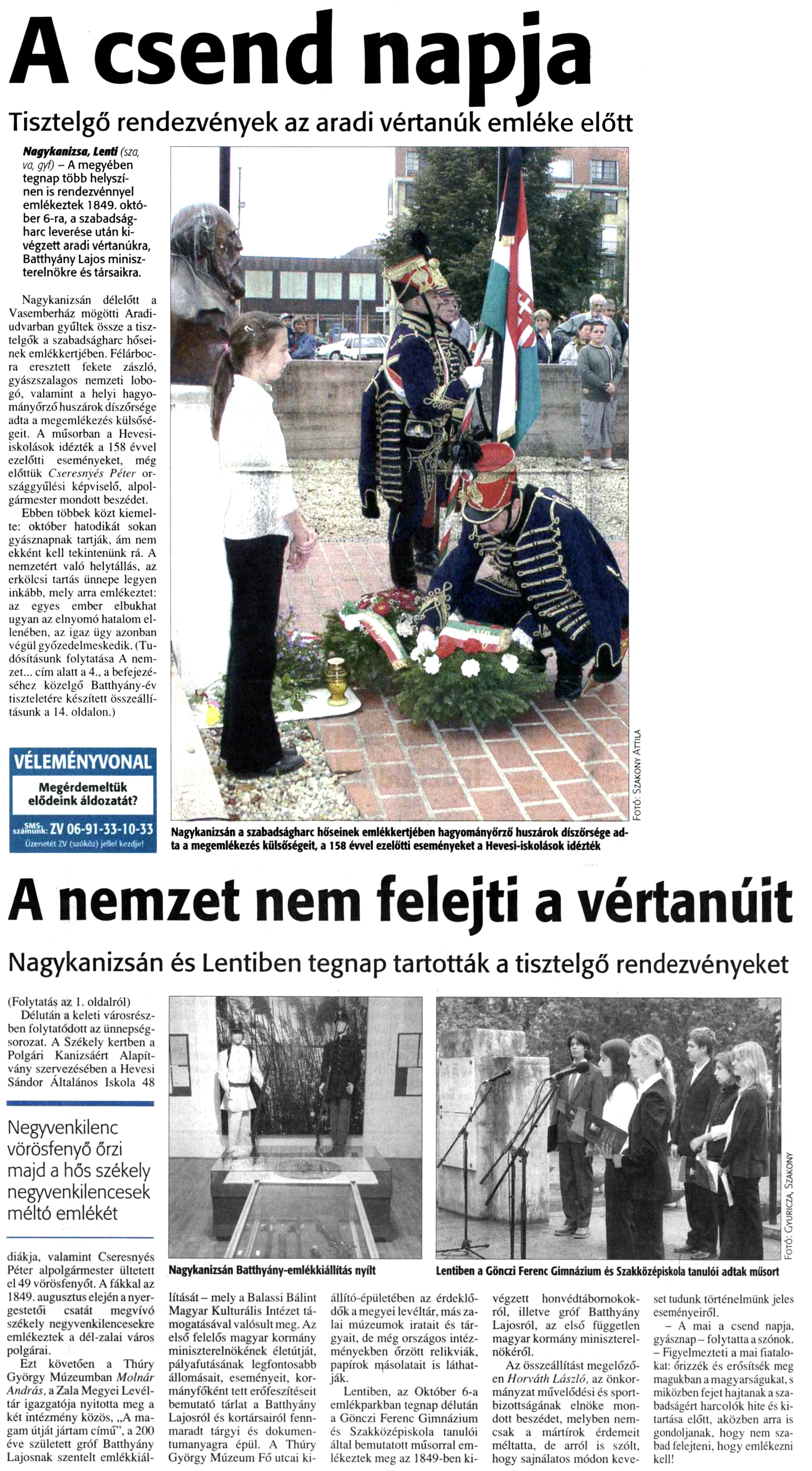 Nyilvános 691 | 928 | Zalai Hírlap 2007. október 6. 1, 4. oldal | A csend napja Tisztelgő rendezvények az aradi vértanúk emléke előtt Nagykanizsa, Lenti (sza, va, gyf) - A megyében tegnap több helyszínen is rendezvénnyel emlékeztek 1849. október 6-ra, a szabadságharc leverése után kivégzett aradi vértanúkra, Batthyány Lajos miniszterelnökre és társaikra. Nagykanizsán délelőtt a Vasemberház mögötti Aradiudvarban gyűltek össze a tisztelgők a szabadságharc hőseinek emlékkertjében. Félárbocra eresztett fekete zászló, gyászszalagos nemzeti lobogó, valamint a helyi hagyományőrző huszárok díszőrsége adta a megemlékezés külsőségeit. A műsorban a Hevesiiskolások idézték a 158 évvel ezelőtti eseményeket, még előttük Cseresnyés Péter országgyűlési képviselő, alpolgármester mondott beszédet. Ebben többek közt kiemelte: október hatodikét sokan gyásznapnak tartják, ám nem ekként kell tekintenünk rá. A nemzetért való helytállás, az erkölcsi tartás ünnepe legyen inkább, mely arra emlékeztet: az egyes ember elbukhat ugyan az elnyomó hatalom ellenében, az igaz ügy azonban végül győzedelmeskedik. (Tudósításunk folytatása A nemzet... cím alatt a 4., a befejezéséhez közelgő Batthyány-év tiszteletére készített összeállításunk a 14. oldalon.) A nemzet nem felejti a vértanúit Nagykanizsán és Lentiben tegnap tartották a tisztelgő rendezvényeket (Folytatás az 1. oldalról) Délután a keleti városrészben folytatódott az ünnepség-sorozat. A Székely kertben a Polgári Kanizsáért Alapítvány szervezésében a Hevesi Sándor Általános Iskola 48 diákja, valamint Cseresnyés Péter alpolgármester ültetett el 49 vörösfenyőt. A fákkal az 1849. augusztus elején a nyergestetői csatát megvívó székely negyvenkilencesekre emlékeztek a dél-zalai város polgárai. Ezt követően a Thúry György Múzeumban Molnár András, a Zala Megyei Levéltár igazgatója nyitotta meg a két intézmény közös, „A magam útját jártam című”, a 200 éve született gróf Batthyány Lajosnak szentelt emlékkiállítását - mely a Balassi Bálint Magyar Kulturális Intézet támogatásával valósult meg. Az első felelős magyar kormány miniszterelnökének életútját, pályafutásának legfontosabb állomásait, eseményeit, kormányfőként tett erőfeszítéseit bemutató tárlat a Batthyány Lajosról és kortársairól fennmaradt tárgyi és dokumentumanyagra épül. A Thúry György Múzeum Fő utcai kiállító- épületében az érdeklődők a megyei levéltár, más zalai múzeumok iratait és tárgyait, de még országos intézményekben őrzött relikviák, papírok másolatait is láthatják. Lentiben, az Október 6-a emlékparkban tegnap délután a Gönczi Ferenc Gimnázium és Szakközépiskola tanulói által bemutatott műsorral emlékeztek meg az 1849-ben kivégzett honvédtábornokokról, illetve gróf Batthyány Lajosról, az első független magyar kormány miniszterelnökéről. Az összeállítást megelőzően Horváth László, az önkormányzat művelődési és sportbizottságának elnöke mondott beszédet, melyben nemcsak a mártírok érdemeit méltatta, de arról is szólt, hogy sajnálatos módon keveset tudunk történelmünk jeles eseményeiről. - A mai a csend napja, gyásznap - folytatta a szónok. - Figyelmezteti a mai fiatalokat: őrizzék és erősítsék meg magukban a magyarságukat, s miközben fejet hajtanak a szabadságért harcolók hite és kitartása előtt, aközben arra is gondoljanak, hogy nem szabad felejteni, hogy emlékezni kell! Nagykanizsán Batthyány-emlékkiállítás nyílt Lentiben a Gönczi Ferenc Gimnázium és Szakközépiskola tanulói adtak műsort |